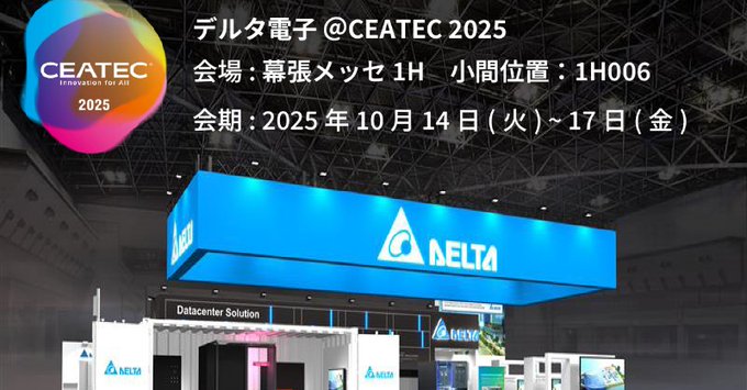 デルタ電子株式会社@Delta_denshiデルタ電子は、今年も「CEATEC 2025」に出展し、インテリジェントで持続可能な社会を実現する最先端のソリューションをご紹介します。AIの進化を支えるデータセンターインフラや、スマートエネルギー管理システムなど、展示を多数ご用意しております。特設ページdelta-japan.jpから17.8万プロモーション