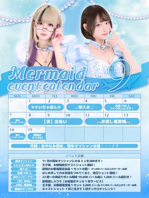 せりなさんがリポストMermaid(マーメイド)秋葉原🧜♀️コンカフェ🌊@mermaid_bar·⋆₊˚⊹︶︶︶ ⋆₊˚⊹︶︶︶ ⋆₊˚⊹ ︶︶︶⋆₊˚⊹ 🩵9月イベントカレンダー🩵 イベントもりだくさん!衣装替えまで🥺🔥 マーメイドの盛り上がりは止まりません!!!27947