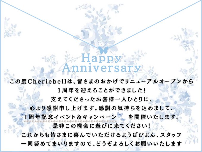 かの【Chérie bell 】@kano_cherie·9月18日おはよー!お休みの間にネイルを変えたよ💅🏻 バラ🌹 ハロウィン先取り!👻 今日は15時から居ます! そして今日からシェリーベル リニューアル1周年記念イベントスタートです✨ 終日セット料金半額&1日1回ガチャ無料になります👍🏻 ガチャの景品はグッズ系から割引系から色々あってお得だよ!引用🦋Chérie bellシェリーベル🦋秋葉原コンカフェ@Papillon_akb·9月1日🤍Happy Anniversary🤍ྀི1116702
