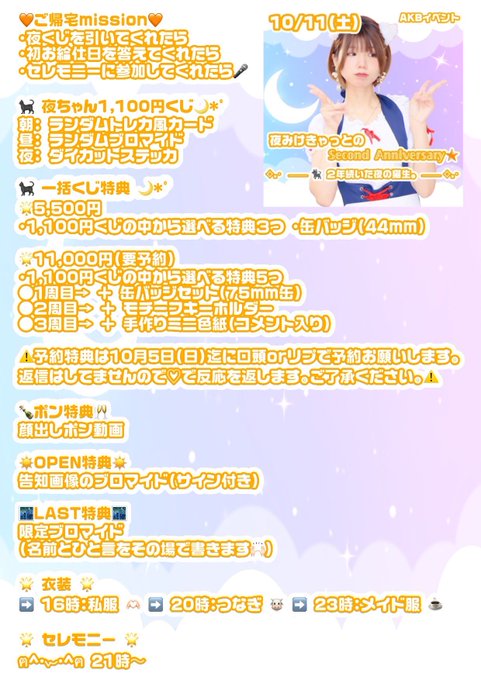 夜@みけねこカフェ秋葉原@yorumikecat·15時間すんませ、起きましたw 屋根ポの前にちょっと宣伝をば。 ・*・:≡⊂( ^ω^ )⊃ 受付は今日の24時まででっす✌🏻 実は昨日予約してくれた人がひとりも居なくてですね…orz笑笑オモロ。 いやまぁ、館に来ておめでとうを言ってくれればもうそれでほんとに…ってのが正直な本音なんで顔見せに来たってw引用夜@みけねこカフェ秋葉原@yorumikecat·10月3日予約スレッド立てまぁぁぁす。ฅ^•𐋣•^ฅ笑 ご予約はこちらのツイートにリプor館にて直接予約の2択でっす🌟 - ̗̀ ෆ(。•⩊•ಣ 33000円で缶バコンプできる様にしてみました笑笑(ただ缶バ作りたかっただけの猫) ちゃんと届くと良いな…缶バwww リプ返は特別な時しかしてないので質問等は館で是非🙌🏻116704