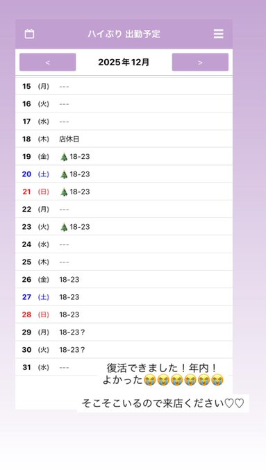 秋葉原・神田 リリーコテージ固定綾瀬すず⚜Lilycottage@mgr_osuzuchan·🎅後半シフト🎄 17日17~RD🪄︎︎ 18日17~lily 19日17~lily 20日14~lily🎄 21日14~lily🎄 23日16~lily🎄 24日16~lily🎄 25日16~lily🎄 26日17~RD🪄︎︎ 27日14~lily🤍こはくBD🎂 28日14~lily 30日16~lily 31日16~20:30lily クリスマス期間絶対きてほしいです🎄🎁🎅店舗シャッフルはツイートみてね🎪113443
