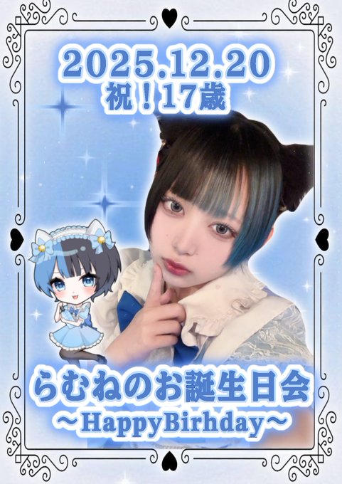 秋葉原・神田 にゃんたー✖️にゃんたーやむ♥さんがリポストらむね@ポテトクルー🍟@ramune_nyano0·めっちゃ遅くなってしまい申し訳ないのですが12月20日にこっそりお誕生日会やらさせてもらいます❕🩵 間に合うかわかんないけどオリシャンも作ったのでぜひお祝いしに来てくれると嬉しいです‼️‼️ おめでとう言いに来てください‼️ お約束はDMにて💭322345