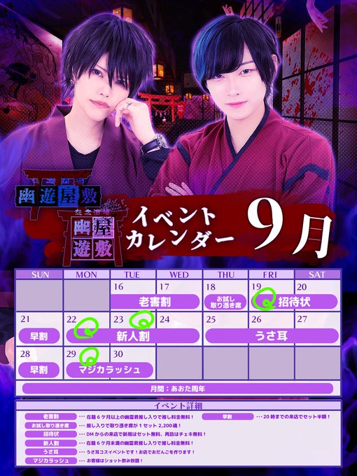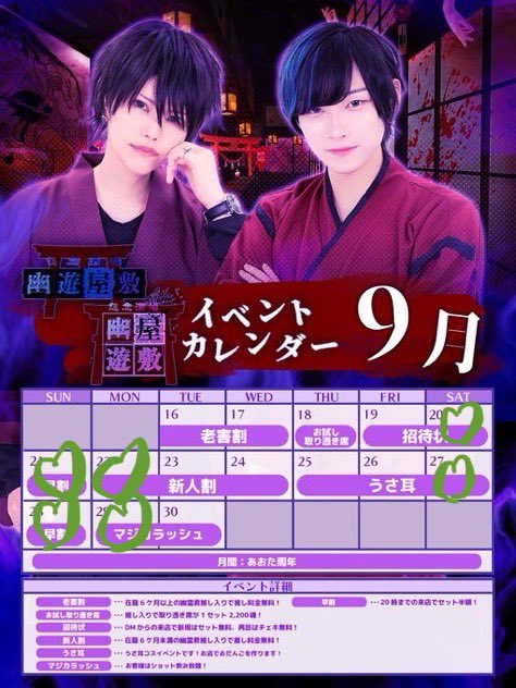 やなぎ@幽遊屋敷@yuyu_yanagi·22時間19日居ないです‼️すみません😭引用やなぎ@幽遊屋敷@yuyu_yanagi·9月9日9月の浮遊コレ‼️ お得なイベント沢山やってます🙌 前半は17:00~22:30 22日からは18:00~22:30になります⚠️ ご参拝考えてる人間様はDMで気軽にご相談くださいまし〜🫶2157