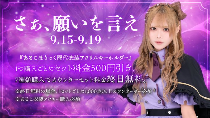 せら@alcoholic_sera·4分います!!!!👀引用【秋葉原コンカフェ】あるこほりっく(16:00〜25:00)@alcoholic_akiba·9月14日╭━ ⋅𖥔⋅ ━━✶━━ ⋅𖥔⋅ ━╮ さぁ、願いを言え 9.15-9.19 ╰━ ⋅𖥔⋅ ━━✶━━ ⋅𖥔⋅ ━╯ あるこほりっく歴代衣装アクキーを 手に入れてお得に楽しもう💫 さらに7️⃣種類揃えると……? 詳しい条件はバナーをチェック!28
