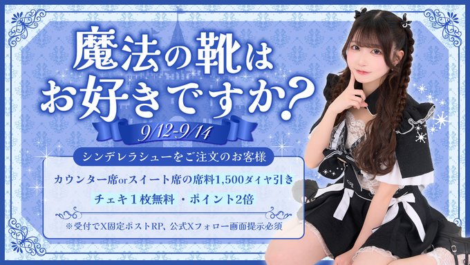 ほむら様さんがリポストClassy Princess👑秋葉原コンカフェ(16:00~25:00)@cp_akb·9月13日19時ですね🏰✨ 王子様お姫様、クラッシープリンセスでお待ちしております💖💖 新人プリンセスの超絶キュートな どくろちゃん👸ほむらちゃん👸 (@cp_dokuro )(@cp_homura ) #秋葉原 #コンカフェ #コンカフェ営業引用Classy Princess👑秋葉原コンカフェ(16:00~25:00)@cp_akb·9月12日。.୨୧⌒⌒⌒⌒⌒⌒⌒⌒⌒⌒⌒⌒୨୧.。 魔法の靴はお好きですか? ☆12~14日開催☆ シンデレラシューをご注文のお客様限定❣ カウンター席orスイート席席料-1500ダイヤ💎 チェキ1枚無料&ポイント2倍!!! ※受付でX固定ポストRP、公式Xフォロー画面提示必須151,023