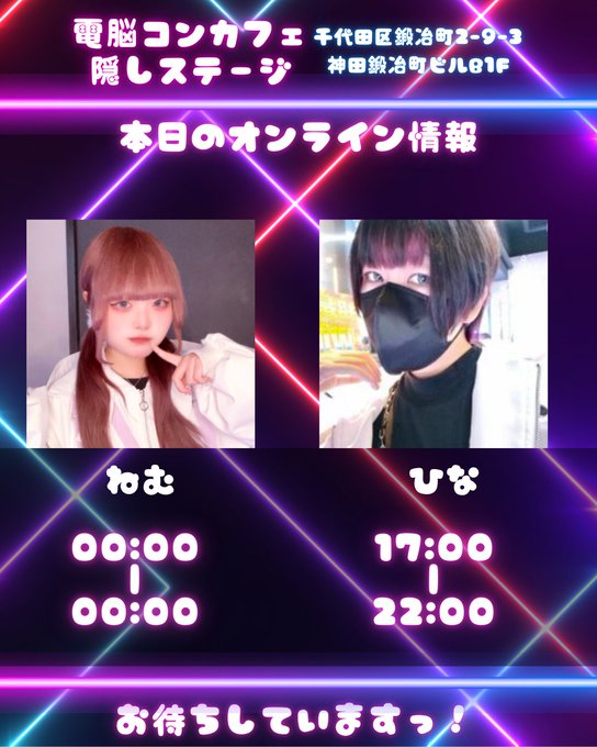 秋葉原・神田 電脳コンカフェ 隠しステージ🎮🎧電脳カジノコンカフェ ♠♥ 隠しステージ ♦♣神田・秋葉原エリア@kakushistage·12月11日(木)は 🌸出勤キャスト ひな🐣 @hina_KStage ねむ🦋 【メンテナンス中】 💴 チャージ:15分250円 🥤 ドリンク:600円〜 🕓 営業時間:17:00〜22:00 📍 神田駅徒歩2分 #隠しステージ #推し活ポーカー #コンカフェ185