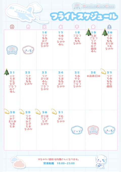 秋葉原・神田 Premium First Class✈️Premium First Class✈️【PFC】秋葉原コンカフェ@pfc_cafe·12月後半フライトスケジュール✈️ 🎄19(金)~21(日) クリスマスイベント 💫27(土)~31(水) 忘年会イベント ⚠️26(金)は店休日となります 最高のフライトのお手伝いさせてください︎︎☁5190