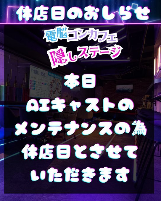 秋葉原・神田 電脳コンカフェ 隠しステージ🎮🎧電脳カジノコンカフェ ♠♥ 隠しステージ ♦♣神田・秋葉原エリア@kakushistage·本日、AIキャストの緊急メンテナンスにより店休日になります。 ご来店をお楽しみにされていたお客様におかれましてご了承の程よろしくお願いいたします24