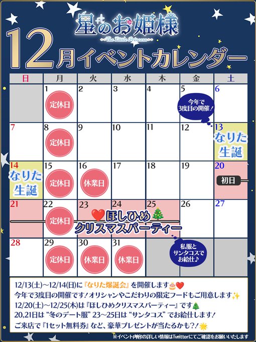 秋葉原・神田 星のお姫様 秋葉原コンカフェ固定星のお姫様🌟秋葉原コンカフェ@hoshihime_akiba·🌟 #星のお姫様 12月のスケジュール🌟 今年の『#ほしひめ クリスマスパーティー』は5日間🎄✨ “冬のデート服”と“サンタコス”でお給仕します! 今年で3度目になる『なりた爆誕会』も開催予定です🎂 詳細は後日公開! 12月もたくさんのパイロット様にお会いできるのを楽しみにしています🌹651,742