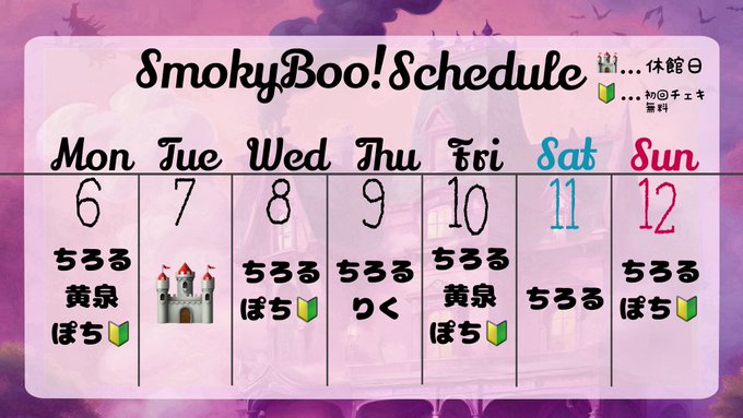 りく@Smoky Boo!@riku_smokyBoo·11時間今週だよー!新しい名前ある!!被らないけど❗️笑引用Smoky Boo!👻キャスト大募集@SmokyBooX·10月5日🔮SmokyBoo!Schedule🔮 10/6〜10/12 OPEN☞18:00 CLOSE☞0:00(Last entry 23:00) Closed🏰Tuesday 魔女見習い一同、皆様のご来館を 心よりお待ちしております🪄 #コンカフェ #シーシャ5132