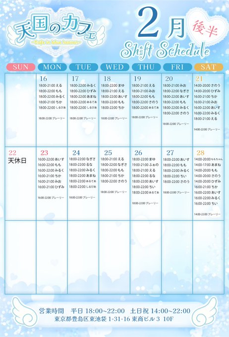 固定天国のカフェ cafe in blue heaven@cafe_blueheaven·🪽2月後半の天使🪽 2026/2/17改訂 #天国のカレンダー #天国のカフェシフト #2026年2月の天使 #池袋コンカフェ275