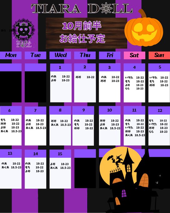 固定👑TIARA DOLL👑 池袋東口のコンカフェ🖤@tiara_doll_·🏴☠️10月前半のお給仕予定🏴☠️ 10/3更新🆙 追加出勤は随時更新していきます 各キャストのSNSもご確認ください💟 今月ハロウィンイベントも⁉️🎃104