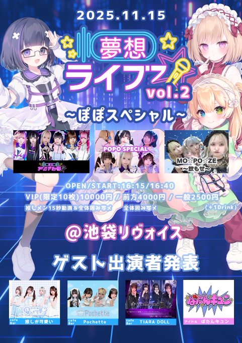 👑TIARA DOLL👑 池袋東口のコンカフェ🖤@tiara_doll_·3時間こちらのアイドルイベント、なんとTIARA DOLLも参加させて頂きます!🎉 当日絶対後悔させないので会場でお待ちしております!👋🏻 当日までの女の子の練習に密着していくので良かったらtiktokフォローして待っててね~! ⬇️ https://tiktok.com/@tiara.doll?_t=ZS-90EvKdORovZ&_r=1…引用夢想基地XXらぼ🧪📟池袋コンカフェ@_XXLAB__·4時間🛜夢想アイドル部通信🛜 夢想アイドル部LIVEやるよ🎤💕︎✨ 『夢想主催LIVE vol.2』 ~ぽぽSPECIAL~ 🗓️11/15(土) 📍池袋リヴォイス 🕔OPEN/START:16:15/16:40 🎟VIP 10,000(最前列+推し15秒動画+囲み写メ) 🎟前方 4,000(囲み写メ) 🎟一般 2,500 +1D/前方と一般のみ+500円で当日券販売さらに表示53476