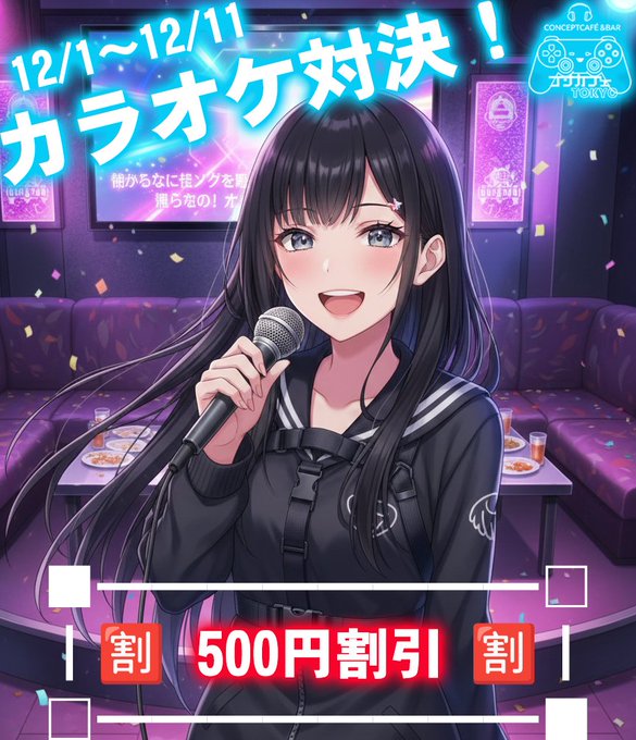 池袋・赤羽・板橋 コンカフェTOKYOコンカフェTOKYO By_ULTRA🎮池袋コンカフェ@gameconcafe·池袋コンカフェ 🎮コンカフェTOKYO🎮 12/2~12/11日はカラオケ対決イベント🉐 🎤女の子とカラオケで対決 お客様が勝てば ■━━━━━━━━□ ┃🈹 500円割引🈹┃ □━━━━━━━━■ ※1日3回限定 ※対戦相手は選べません #コンセプトカフェ63