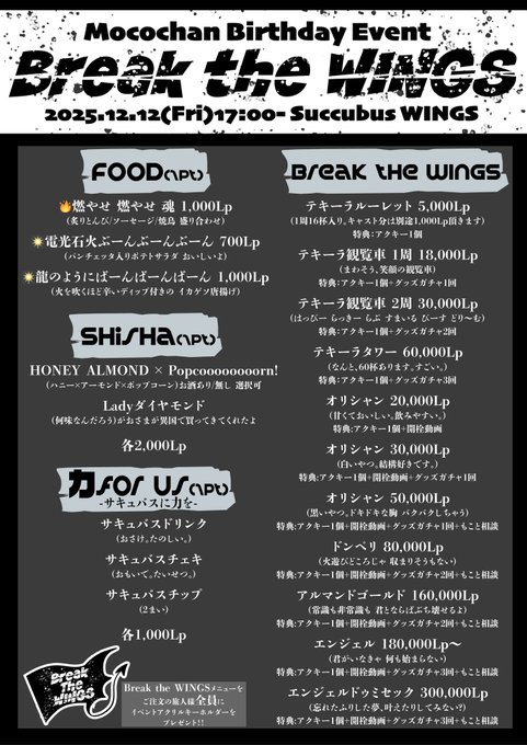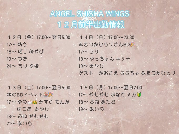 池袋・赤羽・板橋 エンジェルシーシャWINGSエンジェルシーシャWINGS 池袋コンカフェ@WINGS_shisha·エンジェルシーシャ開院です💉💗 👼今日のエンジェル🌟 🤍ゆの@yunomaru_SW 🤍エリナ@erina_wings 🤍もちゃん@ramensukichan_ 🌙さくや@sakuyays86 🌙セレネ 👥本日ビギナーズDAY👥 初めての方シーシャ1台無料🆓 おすすめシーシャ ストロベリーティーmix 営業時間17:00-29:00⏰さらに表示0:06 Grokでオリジナルバージョンを作成26425