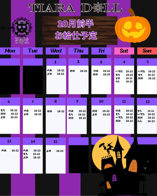 固定👑TIARA DOLL👑 池袋東口のコンカフェ🖤@tiara_doll_·🏴☠️10月前半のお給仕予定🏴☠️ 追加出勤は随時更新していきます 各キャストのSNSもご確認ください💟 今月ハロウィンイベントも⁉️🎃61
