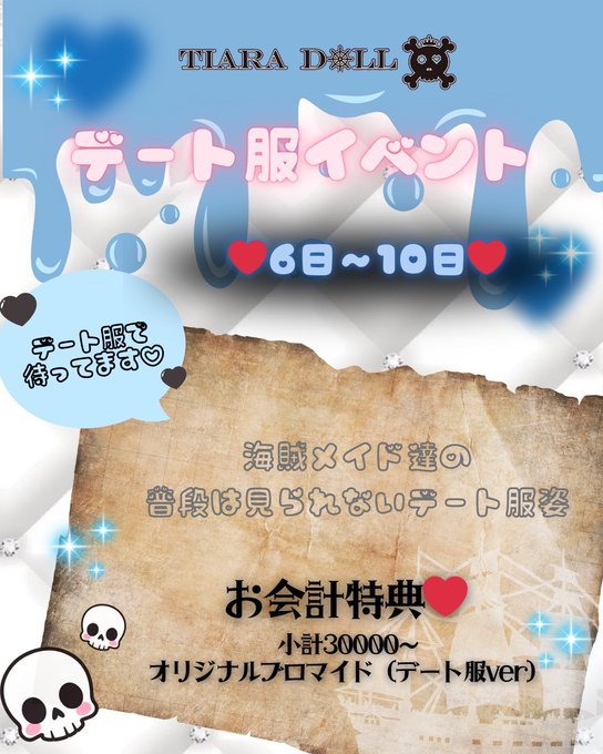 池袋・赤羽・板橋 TIARA DOLL (ティアラドール)👑TIARA DOLL👑 池袋東口のコンカフェ🖤@tiara_doll_·12月6日(土) 👑本日出勤の海賊メイド🏴☠️ めい 18- @2_qtu5 あい 18- @luv_zky7 もち 18- @q4xli のあ 18- @nyannoa2 せな 18- @amrm_67 本日から12月6日〜12月10日はデート服イベントです✨さらに表示25209