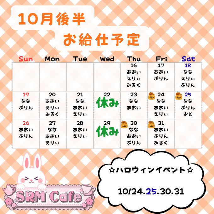 固定みるく👻【SRMカフェ】@milk_SRMCafe·13時間です👻引用SRMカフェ@池袋メイドカフェ@C_SRM_·19時間お待たせいたしました😌✨✨ 10月後半のお給仕予定です❣️ 急な変更がある場合がございますので、 最新の情報はTwitterをご確認ください❣️ ハロウィンイベント開催します🎃👻 お楽しみに❣️ #池袋コンカフェ #池袋メイドカフェ #池袋 #コンカフェ #メイドカフェ #SRMカフェ88