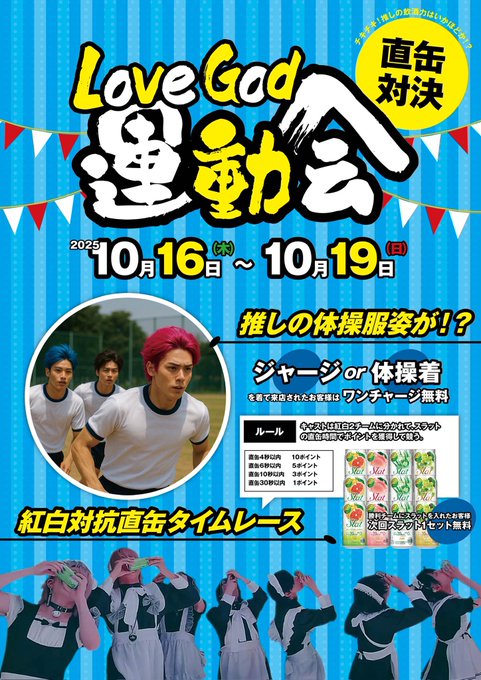 固定Love☦︎God【池袋メンズコンカフェ】@LoveGod6645·◤◢◤◢◤◢◤◢◤◢◤ ◢ 🎃10月のラブゴッド🎃 ◤◢◤◢◤◢◤◢◤◢◤ ◢ 〜秋もラブゴッドで青春を取り戻そう!〜 🏃‍♂️ラブゴッド運動会🏃‍♂️ 10/16(木)〜19(日) ・キャストはジャージor体操着着用⚽️(ハチマキも巻くよ!) ・ジャージor体操着を着て来店されたお客様はチャージ無料‼️さらに表示169402