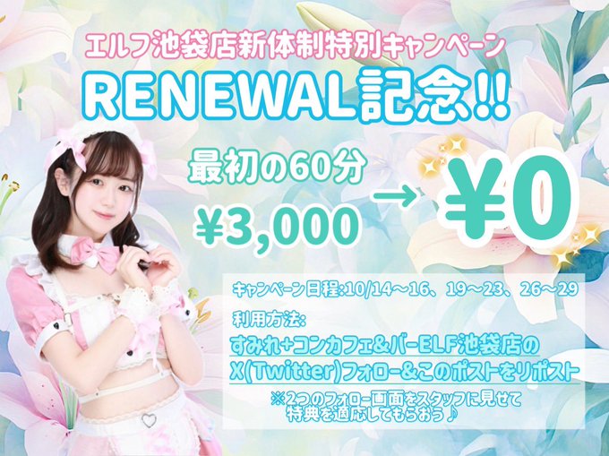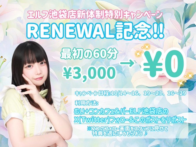 固定すみれ@violet__ELF·【💫新体制特別キャンペーン💫】 🧚‍♀️エルフ池袋店新体制を     記念しましての特別な特典💚 期間… 🗓️10/14~16、19~23、26~29 私とELF池袋店公式Xを… 🌟フォロー&このポストをRPで  最初の60分が0円に⁉︎ この機会に都会の園を覗いてみませんか❔ #池袋 #コンカフェ #池袋といったらエルフ23146