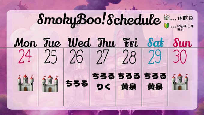 池袋・赤羽・板橋 魔女見習いカフェSmokyBoo!Smoky Boo!👻キャスト大募集さんがリポスト黄泉@Smoky Boo!@yomi_SmokyBoo·5時間すみません😭金曜日ライブなのに間違えて予定申請しちゃいました😭😭今週土曜だけです😭👍よろしく😭😭引用Smoky Boo!👻キャスト大募集@SmokyBooX·11月25日🔮SmokyBoo!Schedule🔮 11/24〜11/30 OPEN☞18:00 CLOSE☞0:00(Last entry 23:00) Closed🏰Monday,Tuesday, Sunday 魔女見習い一同、皆様のご来館を 心よりお待ちしております🪄 #コンカフェ #シーシャ118254