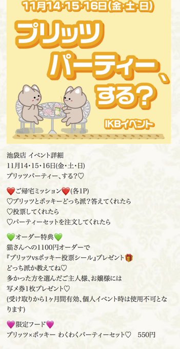 池袋・赤羽・板橋 みけねこカフェ池袋店めんま@みけねこカフェ池袋店@menmamikeneko·本日16時から⸜(* ॑ ॑* )⸝ プリッツパーティー🍬🍭🍫 ご帰宅お待ちしております( ᎔˘꒳˘᎔) #みけねこカフェ池袋店 #メイドカフェ #コンカフェ #お給仕 #またたび #鯖缶 #池袋 #みけねこカフェ #屋根裏6114