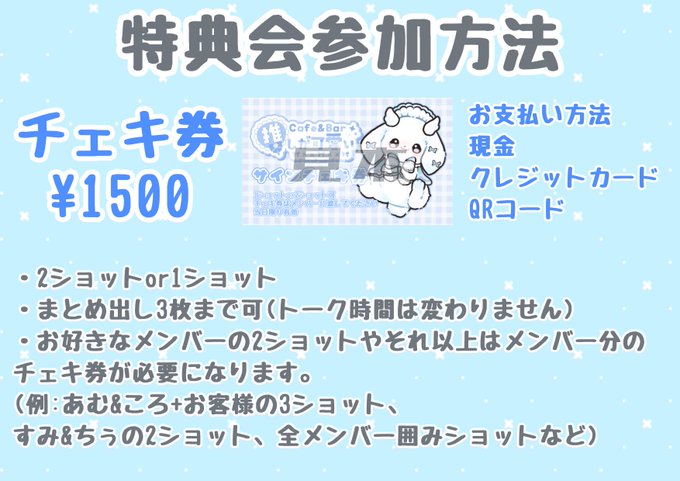 池袋・赤羽・板橋 Cafe&Bar 推しが可愛いCafe&Bar 推しが可愛い【池袋】@oshikawa_ikb·1時間ついに明日本番となりました! 特典会について 終演後の特典会・物販販売前に 対象チケットを持った方の囲み写メ特典から撮影始めさせていただきますのでVIP・前方の方はお早めに列にお並びください! VIPチケ推し15秒動画はチェキお並びの際に伝えてください。 囲み写メ撮影後 ↓ チェキ券販売 ↓さらに表示引用Cafe&Bar 推しが可愛い【池袋】@oshikawa_ikb·10月19日📢ライブ出演時間&追加出演メンバー決定🩵 『夢想主催LIVE vol.2』 ぽぽSPECIAL 11/15(土) 池袋リヴォイス OPEN/START:16:15/16:40 VIP 10,000(最前列+推し15秒動画+囲み写メ) 前方 4,000(囲み写メ) 一般 2,500 +1D/前方と一般のみ+500円で当日券販売 出演 18:00-18:20 特典会 19:00-20:00さらに表示51673