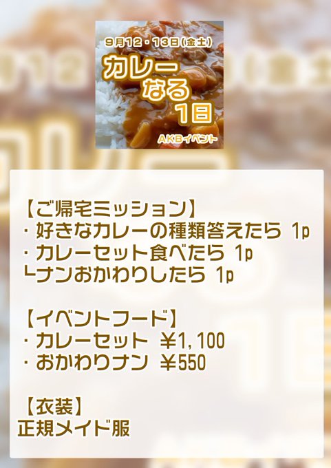 メイド喫茶みけねこカフェ《公式》@nekositujia·#みけねこカフェ秋葉原 👳🏽12.13日カレーなる1日🍛 イベントフード ・カレーセット1100円 ・おかわりナン 550円 カレーは、キーマカレーとバターチキンカレーの2種類! どちらも付いてきます!11102