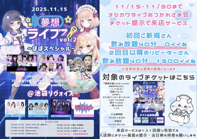 池袋・赤羽・板橋 Cafe&Bar 推しが可愛い固定ころ@ 推しが可愛い@56pocha·9時間🦴今週の出勤日🦴 ついにライブウィーク 15日ライブ終わるまではお酒控えますので ライブ後はパーティーしたいです!! 来店予約、最近少なくてしょんぼりなので 会いに来てくれるの待ってます( ・ᴗ・̥̥̥ )♡ ライブ情報はこちら https://x.com/oshikawa_ikb/status/1979901371777486862?s=46… #コンカフェ #コンカフェ営業 #池袋引用Cafe&Bar 推しが可愛い【池袋】@oshikawa_ikb·10月19日📢ライブ出演時間&追加出演メンバー決定🩵 『夢想主催LIVE vol.2』 ぽぽSPECIAL 11/15(土) 池袋リヴォイス OPEN/START:16:15/16:40 VIP 10,000(最前列+推し15秒動画+囲み写メ) 前方 4,000(囲み写メ) 一般 2,500 +1D/前方と一般のみ+500円で当日券販売 出演 18:00-18:20 特典会 19:00-20:0017478