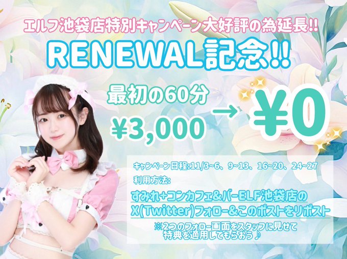 池袋・赤羽・板橋 コンカフェ&バー ELF池袋店すみれ@violet__ELF·【💫新体制特別キャンペーン💫】 🧚♀️大好評だった為 キャンペーン期間を延長💚 期間… 🗓️11/3~6、9~13、16~20、24~27 私とELF池袋店公式Xを… 🌟フォロー&このポストをRPで 最初の60分が0円に⁉︎ この機会に都会の園を覗いてみませんか❔ #池袋 #コンカフェ #池袋といったらエルフ14166