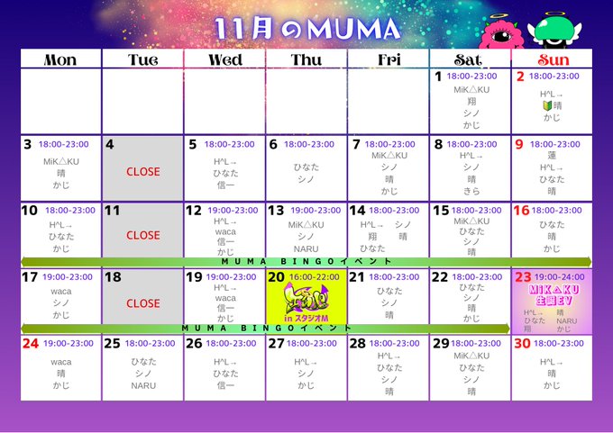 池袋・赤羽・板橋 男装&FTX gender bar MUMAwaca@男装コンカフェ【gender bar MUMA】@waca__MUMA·11月1日11月の予定🗓️ 12、17、19、24日の4日間います! 少なめだけど会いにきてくれたら嬉しい✨引用gender bar MUMA【池袋男装コンカフェ】@barMUMA·10月31日【🗓️11月MUMAスケジュール🗓️】 🔴営業時間をご確認の上ご来店下さい。 🔴営業時間やキャストのシフトは変更となる場合がございます。予めご了承下さい。 #男装MUMA #MUMAシフト #池袋コンカフェ6250