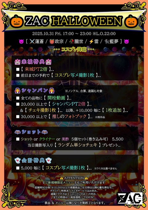 池袋・赤羽・板橋 ≪池袋男装Cafe & Bar【ZAC】≫☦️池袋男装Cafe&Bar【ZAC】☦️@ZAC_BAR·⚜️池袋男装Cafe & Bar【ZAC】⚜️ ◤予告◢ ⚠️明日‼️ 10/31(金)17-23時 ※L.O.22:00 🟧🟧🟧🟧🟪🟪🟪🟪 🎃【ZAC ハロウィン】🎃 🟪🟪🟪🟪🟧🟧🟧🟧 " ⚔️蓮蒼,👹政宗 🥀朧世,⚡️雷,🐈⬛藍夢 " 〈 毎日が池ハロ 〉のZACが贈る 《 ハロウィンパーティー 》🦇 ✅ご予約で【 コスプレ写メ 】貰える💁蓮蒼⚔️男装Cafe&Bar【ZAC】さんと他9人915257