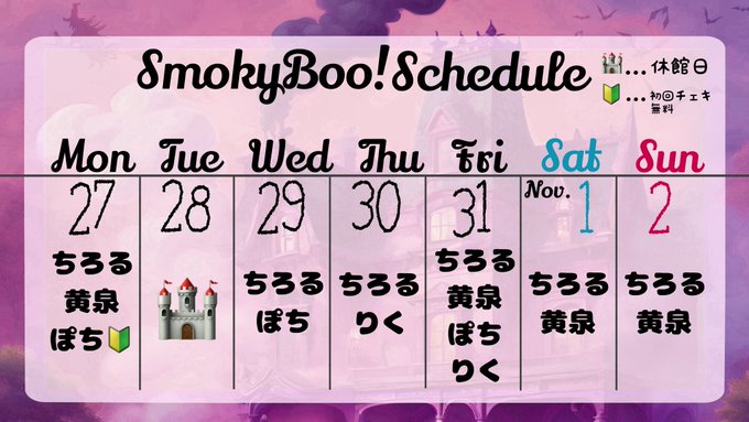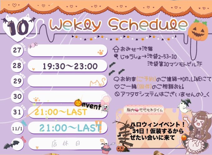 池袋・赤羽・板橋 魔女見習いカフェSmokyBoo!黄泉@Smoky Boo!@yomi_SmokyBoo·21時間閉館👍次もうハロウィンイベです😶🌫️ かわいいけど外出たら寒すぎる格好でまってるぜ🪓🪓🪓 2日間対よろ😶🌫️引用Smoky Boo!👻キャスト大募集@SmokyBooX·10月26日🔮SmokyBoo!Schedule🔮 10/27〜11/2 OPEN☞18:00 CLOSE☞0:00(Last entry 23:00) Closed🏰Tuesday 10/31(金).11/1(土) 《Smoky Boo!HALLOWEEN〜使い魔の暴走〜》 禁断の魔法で貴方の心を誘惑いたします! 限定セットもおすすめです✨ 魔女見習い一同、皆様のご来館を 心よりお待ちしております🪄1212434