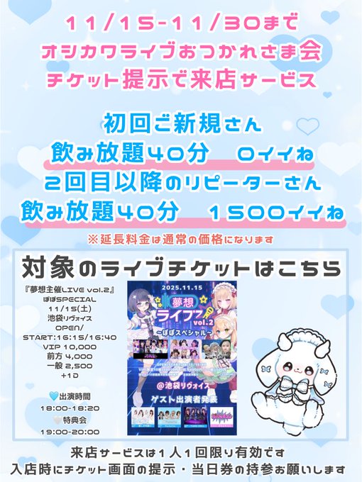 池袋・赤羽・板橋 Cafe&Bar 推しが可愛いCafe&Bar 推しが可愛い【池袋】@oshikawa_ikb·2時間ライブ後オシカワに来店してくれたお客様限定に 来店サービスしちゃいます🩵✨ 当日11/15以降11月中はチケットを持ってオシカワに集まれ~! (ライブ出演キャストは当日特典会終了後から出勤予定です)引用Cafe&Bar 推しが可愛い【池袋】@oshikawa_ikb·10月19日📢ライブ出演時間&追加出演メンバー決定🩵 『夢想主催LIVE vol.2』 ぽぽSPECIAL 11/15(土) 池袋リヴォイス OPEN/START:16:15/16:40 VIP 10,000(最前列+推し15秒動画+囲み写メ) 前方 4,000(囲み写メ) 一般 2,500 +1D/前方と一般のみ+500円で当日券販売 出演 18:00-18:20 特典会 19:00-20:00411,143