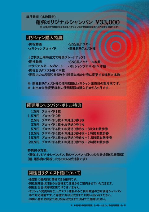 池袋・赤羽・板橋 男装&FTX gender bar MUMA蓮😈池袋barMUMAさんがリポストgender bar MUMA【池袋男装コンカフェ】@barMUMA·【✨オリジナルシャンパン告知✨】 当店キャストの蓮(@ren_muma)こと コスプレイヤーの蓮弥(@renxsuke)さんの10月オリジナルシャンパンが発売🍾 🔴販売開始日時 10/10(金)19:00〜 🔴販売数 5本限定 🔴販売価格 33,000円(税込) 🔴支払方法 店頭入金、PayPay、銀行振込さらに表示蓮😈池袋barMUMAさんと他1人452,517