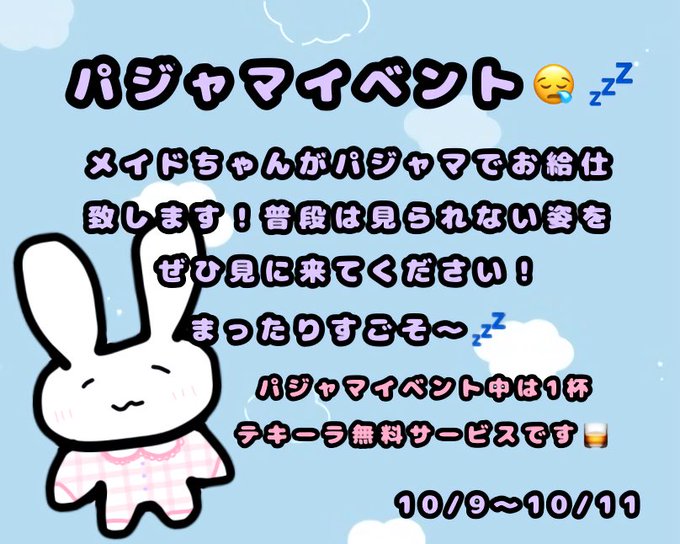 池袋・赤羽・板橋 ヨル・ココンひめの🐰さんがリポスト【 コンカフェ】ココン / 西池袋@cocon_maidbar·10月9日から11日はココンパジャマイベントです😪 メイドちゃんたちの普段は見れないオフな姿、是非見に来てください(´っ ·̫ ⌯ )♡ ご帰宅してくださったご主人様、お嬢様にテキーラ1杯サービスもございます!✨ #池袋コンカフェ #コンカフェ22902