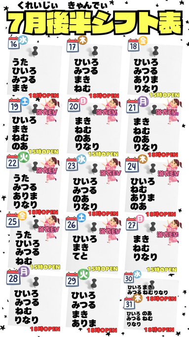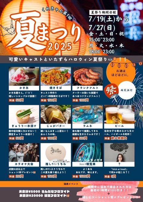 固定Crazy Candy(池袋コンカフェ)🦇🍭@CRAZYCANDY_IKB·お待たせ致しました🦇🍭" 7月後半シフト表です‼️ 7/19(土)~7/27(日)迄 浴衣夏祭りイベント👘🎆 期間中浴衣でご来店の方は 最初の1Time¥1000引+写メ🎁 詳細は画像参照🪅❤️ 🏠〒170-0013 東京都豊島区東池袋1-13-12 JETビル B1F『Crazy Candy』 沢山のお客様の来店をお待ちしております🥂 _6152,334