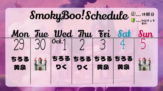 りく@Smoky Boo!@riku_smokyBoo·9月30日こんしゅ❗️よろ❗️引用Smoky Boo!👻キャスト大募集@SmokyBooX·9月26日🔮SmokyBoo!Schedule🔮 9/29〜10/5 OPEN☞18:00 CLOSE☞0:00 Closed🏰Tuesday, Sunday 魔女見習い一同、皆様のご来館を 心よりお待ちしております🪄 #コンカフェ #シーシャ3173