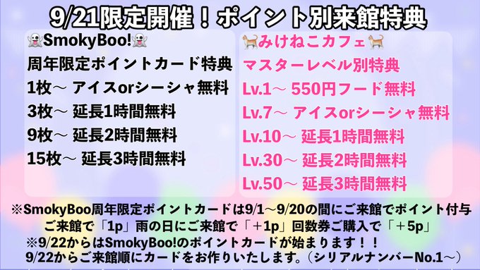 夢磨ちろる@Smoky Boo!@TIROL_pyon·9月21日1周年の本日限定で、系列店の「みけねこカフェ」さんのポイントカードのマスターレベルに応じてプレゼントや延長が無料になります!! 今日限りのお得な機会ですので、この機会にご主人様お嬢様方もSmokyBoo!へ遊びにいらしてくださいね🪄引用Smoky Boo!👻キャスト大募集@SmokyBooX·9月21日本日限定‼️1周年限定‼️ x.com/smokyboox/stat…191,650
