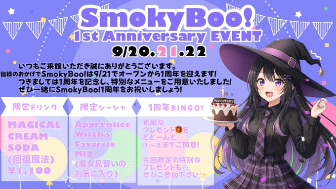 黄泉@Smoky Boo!@yomi_SmokyBoo·9月20日お席たくさんあります🤩🫵 普段ご主人やってる方も特典あるよ〜🤩🤩‼️‼️ ビンゴカードも実物アツいですよろしく🤩🤩‼️ #池袋コンカフェ #シーシャ引用Smoky Boo!👻キャスト大募集@SmokyBooX·9月20日SmokyBoo!閉館いたしました。 本日もご来館、誠にありがとうごさいました🏰✨ 明日のSmokyBoo!は 《SmokyBoo!1stAnniversaryEvent》 9/20.21.22 1周年イベントいよいよ初日です! 皆様のご来館を心よりお待ち申し上げております🪄 #コンカフェ #池袋コンカフェ19505