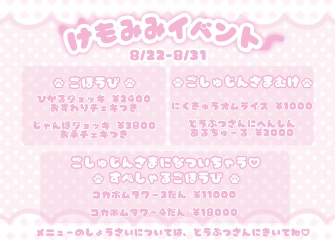 ゆぴさんがリポスト赤羽No.1コンセプトカフェ🩵🎤Bee🎤🩵@ConceptCafe_Bee·8/22~8/31 は ケモ耳イベント🐈🎀 イベント限定の楽しいメニューをご用意しました❕ 期間中、キャストちゃんはどうぶつさんに変身します🎶 推しキャストちゃんはなんのどうぶつに変身するかな…❔❔ 皆様のご来店をお待ちしてます🐇💗12127,210