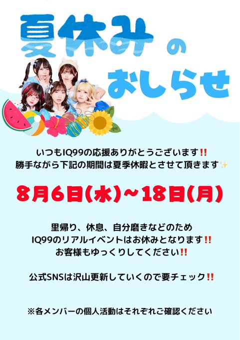 松山ごま🐱🦊@Goma_matsuyama·15時間わたしはこのスケジュールのもと動いているから、叶えてあげたいけど叶えられない出走もある…😭引用IQ99(アイキューキューキュー)@___IQ99___·8月1日【🎡#IQ99 イベントスケジュール🎢】 ▼▼予約詳細はこちらから▼▼ https://iq99-official.com/schedule/ 🎧サブスク🎧 https://nex-tone.link/A00175385 8月は6〜18が夏休み✨ 会える日が少ないから会いに来て❣️ 1本1本が超勝負‼️ IQ99の良さを広めるゥ💥✊✨113695