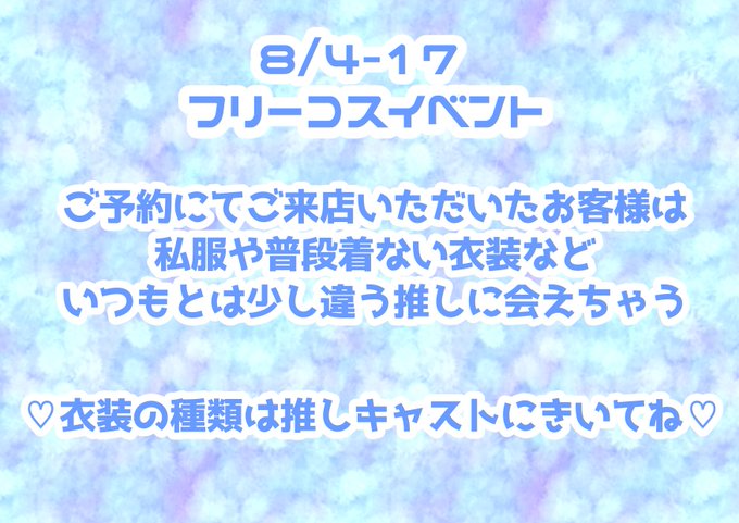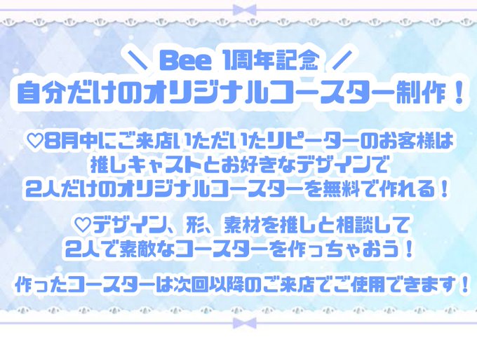そらさんがリポスト赤羽No.1コンセプトカフェ🩵🎤Bee🎤🩵@ConceptCafe_Bee·Bee1周年イベントのお知らせ- ̗̀ 📢💭 🩵8/4-17 フリーコスイベ 上記期間中、ご予約のお客様は推しに着て欲しい衣装を指定可能! 衣装の相談はキャストまで✉️ 🩵オリジナルコースター制作 8月中にご来店いただいたお客様は、推しと自分だけのコースターを制作可能! 詳しくは画像をご覧ください❤︎13220