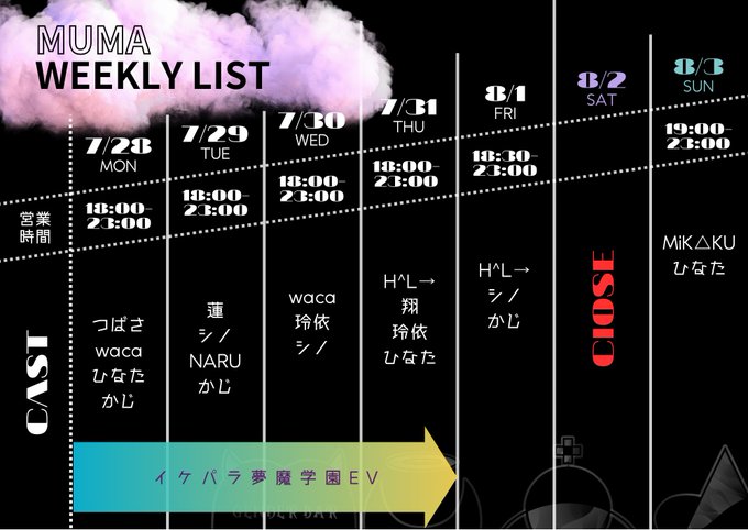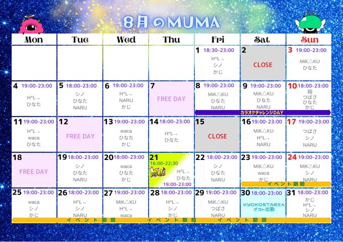 シノ@男装コンカフェ【gender bar MUMA】さんがリポストgender bar MUMA【池袋男装コンカフェ】@barMUMA·【🗓️8月MUMAスケジュール🗓️】 🔴営業時間をご確認の上ご来店下さい。 🔴「FREE DAY」は当日まで何が起きるか分かりません。店休になる場合もございますので、毎日のポストをお見逃しなく! 🔴営業時間やキャストのシフトは変更となる場合がございます。予めご了承下さい。 #男装MUMA #MUMAシフト761,346