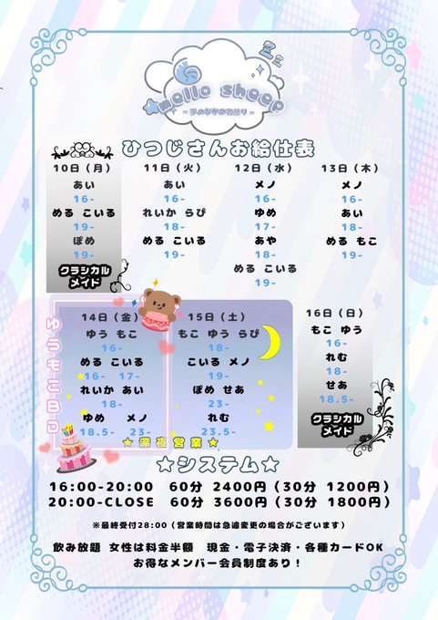 埼玉西エリア・川越・坂戸・東松山 mellow sheepmello sheep ໒꒱· ゚ᶻᶻ 【 コンカフェ 】@mello_sheep·🐳🌧️ 来 週 の お 給 仕 予 定 ❄️+¨281