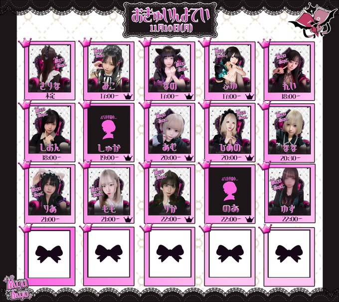 川崎・横浜・関内 MyuMyu🩷MyuMyu川崎🖤@MyuMyu_kawasaki·🖤MyuMyu通信🩷 11月もイベント毎日開催🎶 🎰 ガチャ割引 💖 初めまして割 【👑本日の出勤情報👑】 🖤とい17- 🩷れい17- 🖤あむ20- 🩷ひめの20- ➡️ 各SNSはこちらからチェック💌 🔗 https://lit.link/myumyu-kawasaki144
