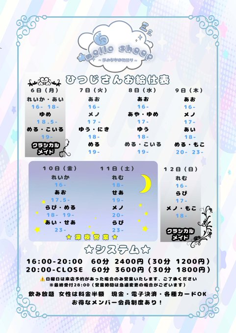 mello sheep ໒꒱· ゚ᶻᶻ 【 コンカフェ 】@mello_sheep·🧊お - ぷ ん🪽 + ° ¨ 🎼 本 日 、ク ラ シ カ ル メ イ ド day 🐈⬛❕ 【 16:0 0 - 24:00 】 1 6 : 0 0 - 🍽 れ い か 1 8 : 0 0 - 🥛 あ い 1 8 : 3 0 - 🤍 ゆ め 1 9 : 0 0 - 🍼 め る 🦢 こ い る283