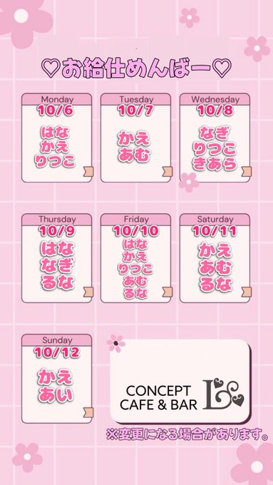 水戸コンカフェ&バーL@ccb_l_mito·🫶🏻今週の出勤情報🫶🏻 いつもご帰宅ありがとうございます!!! 今週のお給仕メンバーをお知らせいたします📢 みなさまのご帰宅をお待ちしてます♡ ※出勤メンバーは変更になる場合がございます。 #コンカフェ #茨城 #水戸80