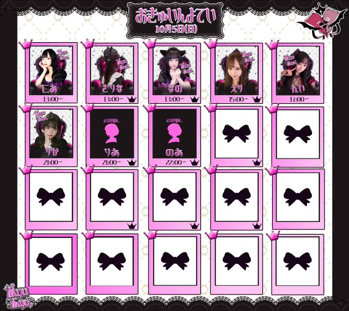 🩷MyuMyu川崎🖤@MyuMyu_kawasaki·🖤MyuMyu通信🩷 10月もイベント毎日開催🎶 🎰 ガチャ割引 💖 初めまして割 【👑本日の出勤情報👑】 🖤にあ13- 🩷さりな13- 🖤なの13- 🩷えり15- 🖤れい17- 🩷りか21- 🖤りあ21- 🩷のあ22- ➡️ 各SNSはこちらからチェック💌 🔗 https://lit.link/myumyu-kawasaki42