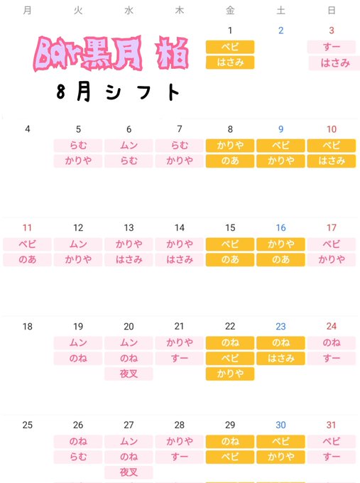 固定【川崎】あすとろ×まりん【コンカフェ】@astro_marin·8月前半のシフトです。日曜のキャストが追加になったのであげ直しです。 8.9.10はメイド服Day🫶 延長1時間につき1100円引きのお得な営業日となります✨ 22.23は夏祭りイベント開催🏮👘✨こちらは後日詳細を出します。 #あすとろまりん #コンカフェ #川崎 #メイド #メイドカフェ135698